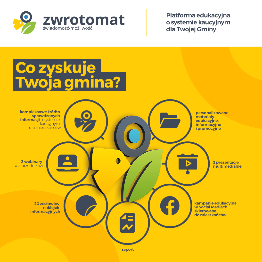 Zwrotomat.pl to kompleksowe wsparcie edukacyjne stworzone z myślą o gminach i miastach. Platforma pozwala w prosty sposób realizować obowiązki informacyjne i edukacyjne wynikające z ustawy o utrzymaniu czystości i porządku w gminach. W ramach rocznego abonamentu Fundacja Odzyskaj Środowisko zapewnia: